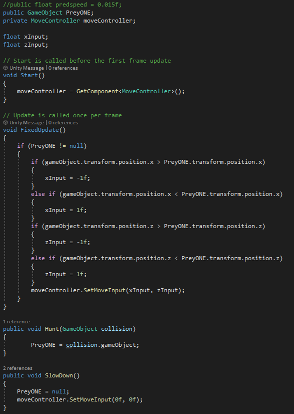 Territorial is an animal behavior where the Object sits still and when a certain type of Object enters its “Zone” it will chase them off. The way this is written in code is that the Host Object has a collision sphere around the Host at a certain range and when a Intruder enters that range the Host will lunge towards the Intruder and then stop moving. If the Intruder is still within that range after the Host has lunged it will do so again until the Intruder is out of range.